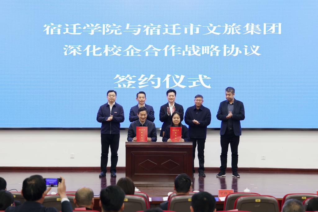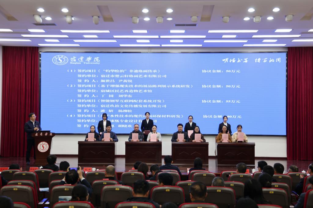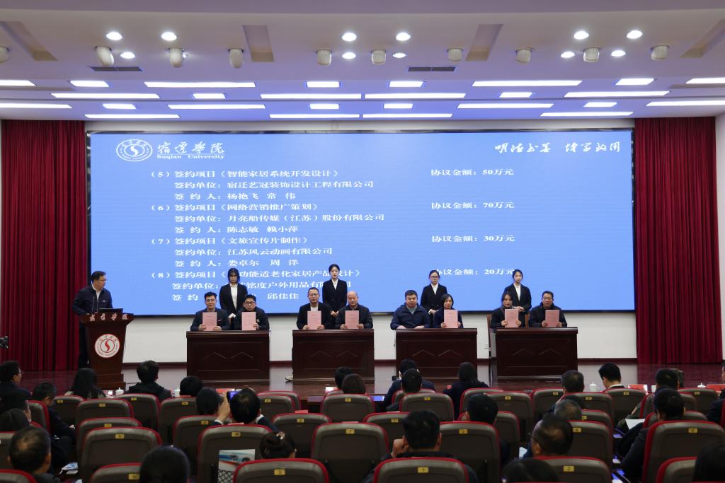 开幕式上,丁红燕与陈飞共同签订了“宿迁学院与宿迁文化旅游发展有限公司深化校企合作战略协议”,并为“宿迁市文旅产品创意中心”揭牌;艺术与传媒学院院长邵士德、宿迁市文化广电和旅游局副局长刘冰共同为“宿迁市非物质文化遗产研究基地”揭牌;江苏项王故里景区旅游发展有限公司、沭阳海洋馆、宿迁蒹葭文化发展有限公司三家文旅重点企业进行了企业宣讲和需求发布;8个文旅项目进行了现场签约,涉及景区升级、文化IP开发、数字文旅等多个领域,协议金额405万元。