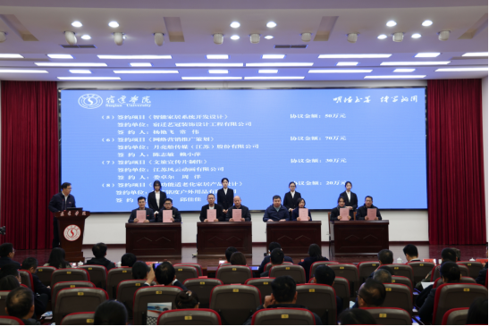 开幕式由宿迁学院党委常委副校长章程主持。宿迁市文旅集团总经理陈飞首先致辞。他表示,此次产学研对接是文旅产业与高等教育深度融合的重要实践。希望宿迁学院能够持续发挥学科优势,继续为地方文旅产业提供强有力的智力支持和人才保障,通过此次活动,双方能够围绕文化遗产活化、文创产品开发、数字文旅创新等领域展开全方位合作,形成一批具有示范效应的合作成果。随后,宿迁学院副校长丁红燕与宿迁文化旅游发展集团有限公司总经理陈飞共同签订了“宿迁学院与宿迁文化旅游发展有限公司深化校企合作战略协议”,并为“宿迁市文旅产品创意中心”揭牌,宿迁学院艺术与传媒学院院长邵士德、宿迁市文化广电和旅游局副局长刘冰共同为“宿迁市非物质文化遗产研究基地”揭牌。江苏项王故里景区旅游发展有限公司、沭阳海洋馆、宿迁蒹葭文化发展有限公司等三家文旅重点企业企业进行了企业宣讲和需求发布。本次活动促成 8 个文旅项目现场签约,涉及景区升级、文化 IP 开发、数字文旅等多个领域,协议金额405万元。